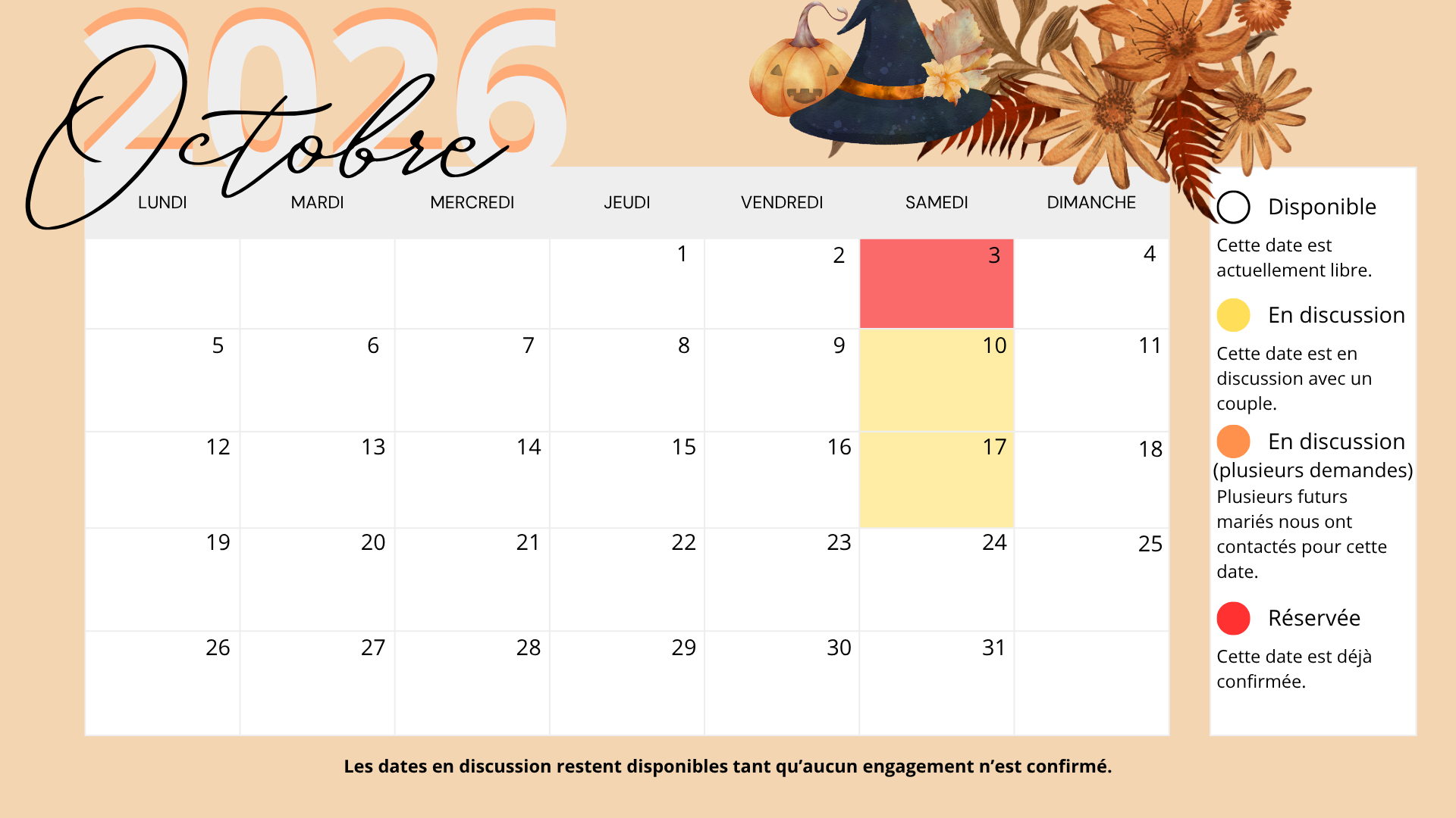 Ce calendrier vous permet de voir en un clin d’œil nos disponibilités, les dates déjà réservées et celles en discussion.